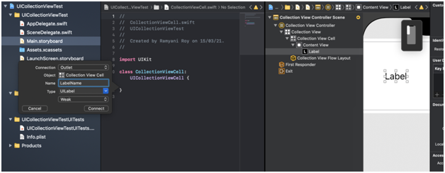Now we need to create an outlet connection from this label to the cell and name it, say, “LabelName”.