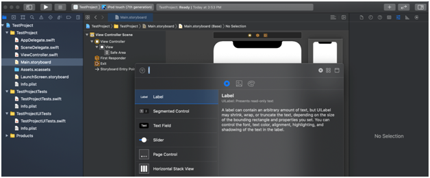 Let’s navigate to the Main.Storyboard on the right and drag and drop a label onto the screen from the media library.