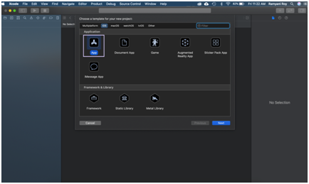 For org. name, use either the name of the company you’re developing the application for or pick an arbitrary name. The organization identifier reads the input in reverse so apple.com is input as com.apple The bundle identifier auto-concatenates the organization identifier and product name. Bundle identifiers are unique and no two applications on the same phone can have identical bundle identifiers. In the language, select the language with which we are planning the development. In this tutorial, we will use Swift as our programming language.